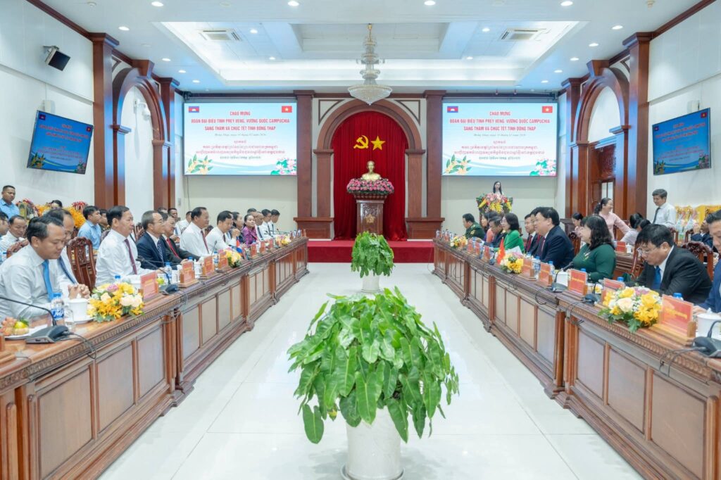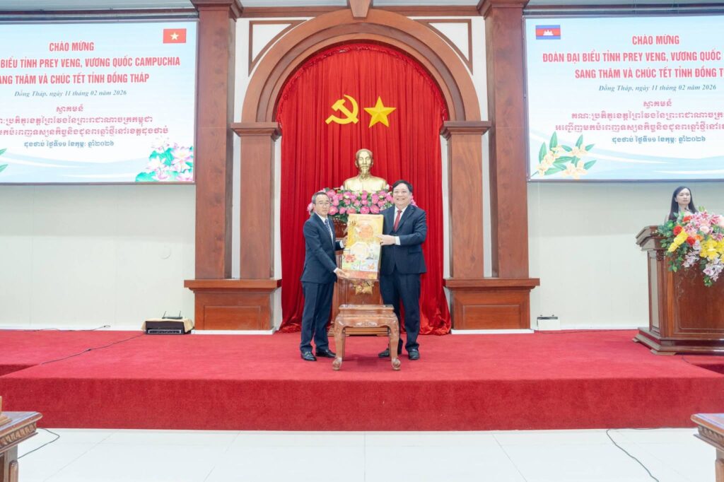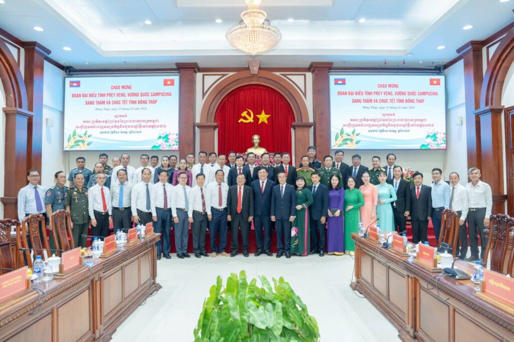 នៅព្រឹកថ្ងៃពុធ ទី១១ ខែកុម្ភៈ ឆ្នាំ២០២៦ ឯកឧត្តម សួន សុម៉ាលីន អភិបាល នៃគណ: អភិបាលខេត្តព្រៃវែង និងឯកឧត្តម ស្បោង សារ៉ាត ប្រធានក្រុមប្រឹក្សាខេត្ត រួមជាមួយថ្នាក់ដឹកនាំខេត្តព្រៃវែង បានអញ្ជើញបំពេញទស្សនកិច្ច និងចូលរួមពិធីអបអរសាទរជូនពរឆ្នាំថ្មីប្រពៃណីជាតិវៀតណា ឆ្នាំមមី អដ្ឋស័ក គ្រិស្តសករាជ ២០២៦ ដែលពិធីនេះប្រព្រឹត្តទៅនៅខេត្តដុងថាប់ ប្រទេសវៀតណាម។