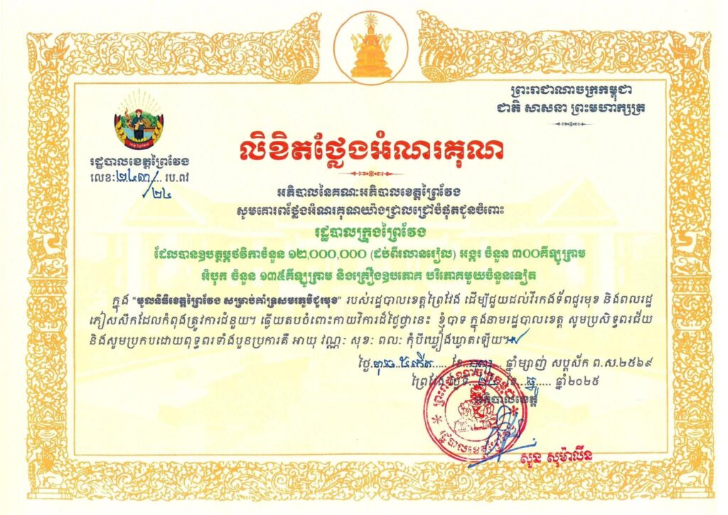 (ព្រៃវែង) : ឯកឧត្តម សួន សុម៉ាលីន អភិបាល នៃគណ: អភិបាលខេត្តព្រៃវែង នៅថ្ងៃទី២៥ ខែធ្នូ ឆ្នាំ២០២៥ រដ្ឋបាលខេត្តព្រៃវែង សូមថ្លែងអំណរគុណយ៉ាងជ្រាលជ្រៅចំពោះ រដ្ឋបាលក្រុងព្រៃវែង ដែលបានឧបត្ថម្ភថវិកា ចំនួន ១២,០០០,០០០ (ដប់ពីរលានរៀលគត់) អង្ករ ចំនួន ៣០០គីឡូក្រាម អំបុក ចំនួន១៣៥ គីឡូក្រាម និងគ្រឿងឧបភោគ បរិភោគមួយចំនួនទៀត ក្នុង“មូលនិធិខេត្តព្រៃវែង សម្រាប់គាំទ្រសមរភូមិជួរមុខ” ដើម្បីជួយគាំទ្រលើកទឹកចិត្តដល់វីរកងទ័ពកម្ពុជា ដែលកំពុងឈរជើងការពារបូរណភាពទឹកដី និងអធិបតេយ្យជាតិ ពីការឈ្លានពានរបស់សត្រូវ រួមទាំងការចូលរួមដល់ជនភៀសសឹកដែលកំពុងជម្លៀសខ្លួនដែលត្រូវការជំនួយសម្រាប់ដោះស្រាយជីវភាពប្រចាំថ្ងៃ។រដ្ឋបាលខេត្ត សូមជូនពរ រដ្ឋបាលក្រុងព្រៃវែង សូមជួបនូវពុទ្ធពរទាំងបួនប្រការគឺ អាយុ វណ្ណៈ សុខៈ ពលៈ កុំបីឃ្លៀងឃ្លាតឡើយ។