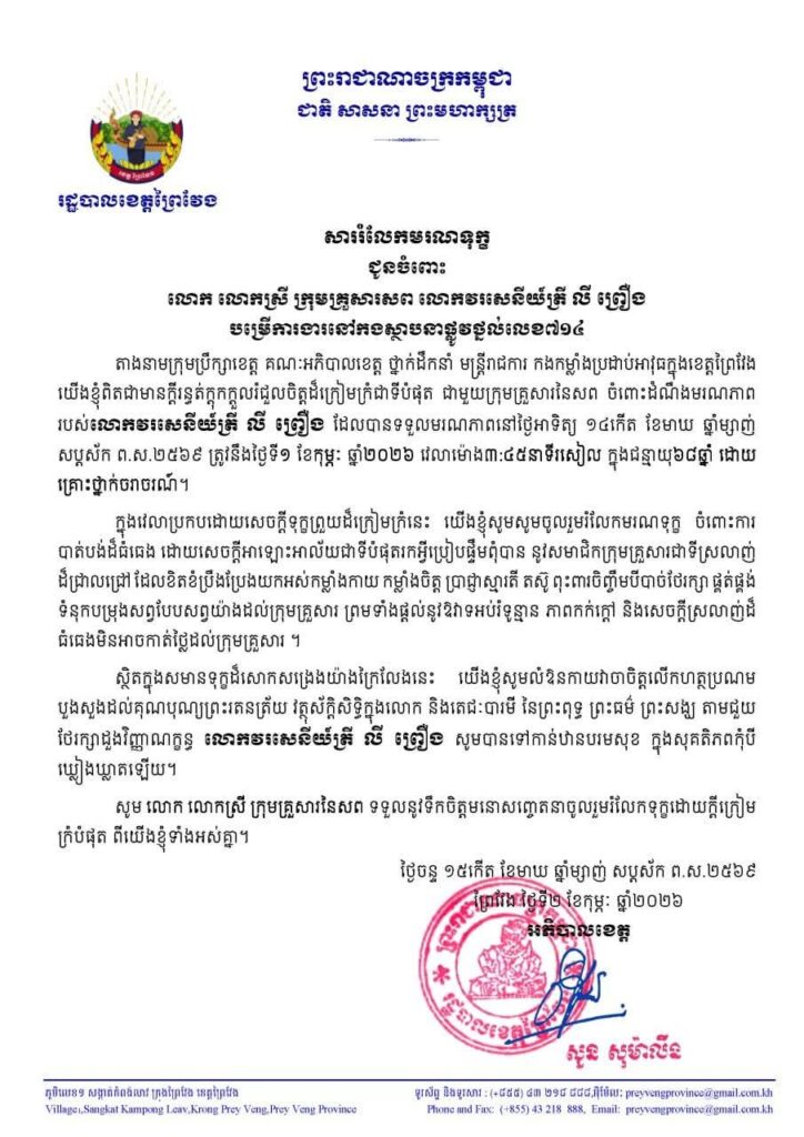 (ព្រៃវែង) : ឯកឧត្តម សួន សុម៉ាលីន អភិបាល នៃគណ: អភិបាលខេត្តព្រៃវែង តាងនាមក្រុមប្រឹក្សាខេត្ត គណ:អភិបាលខេត្ត ថ្នាក់នាំដឹកនាំ មន្ដ្រីរាជការ កងកម្លាំងប្រដាប់អាវុធក្នុងខេត្តព្រៃវែង យើងខ្ញុំពិតជាមានក្ដីរន្ធត់ក្ដុកក្ដួលរំជួលចិត្តដ៍ក្រៀមក្រំជាទីបំផុត ជាមួយក្រុមគ្រួសារនៃសព ចំពោះដំណឹងមរណភាពរបស់ លោកវរសេនីយ៍ត្រី លី ព្រឿង បម្រើការងារនៅកងស្ថាបនាផ្លូវថ្មល់លេខ៧១៤ ដែលបានទទួលមរណភាពនៅថ្ងៃអាទិត្យ ១៤កើត ខែមាឃ ឆ្នាំម្សាញ់ សប្តស័ក ព ស. ២៥៦៩ ត្រូវនឹងថ្ងៃទី០១ ខែកុម្ភ: ឆ្នាំ២០២៦ វេលាម៉ោង៣. ៤៥ នាទីរសៀល ក្នុងជន្មាយុ៦៨ឆ្នាំ ដោយគ្រោះថ្នាក់ចរាចរណ៍។